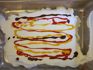 First, fill a cake pan with shaving cream.